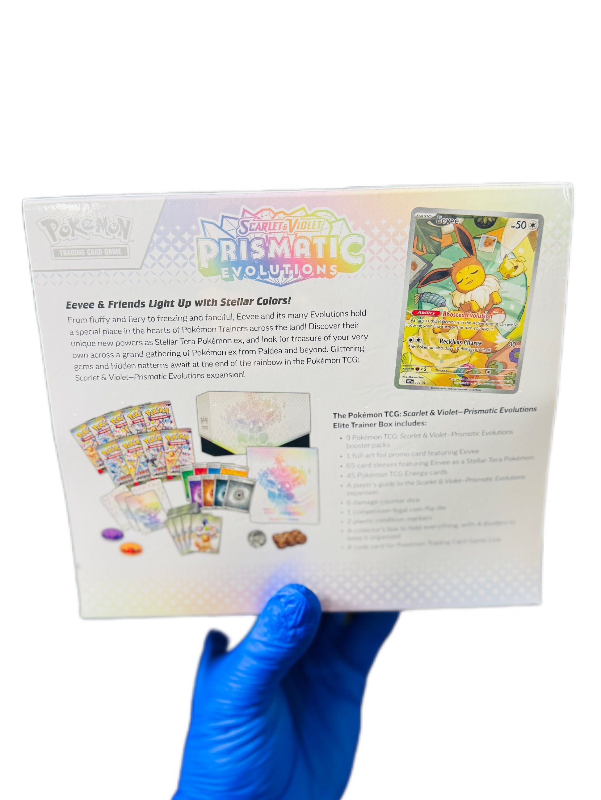 The Pokémon TCG: Scarlet & Violet—Prismatic Evolutions Pokémon Center Elite Trainer Box includes: