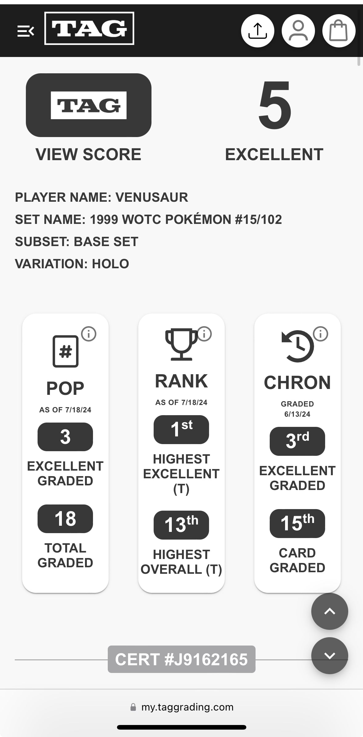 Venusaur Holo Base Set #15 Graded TAG