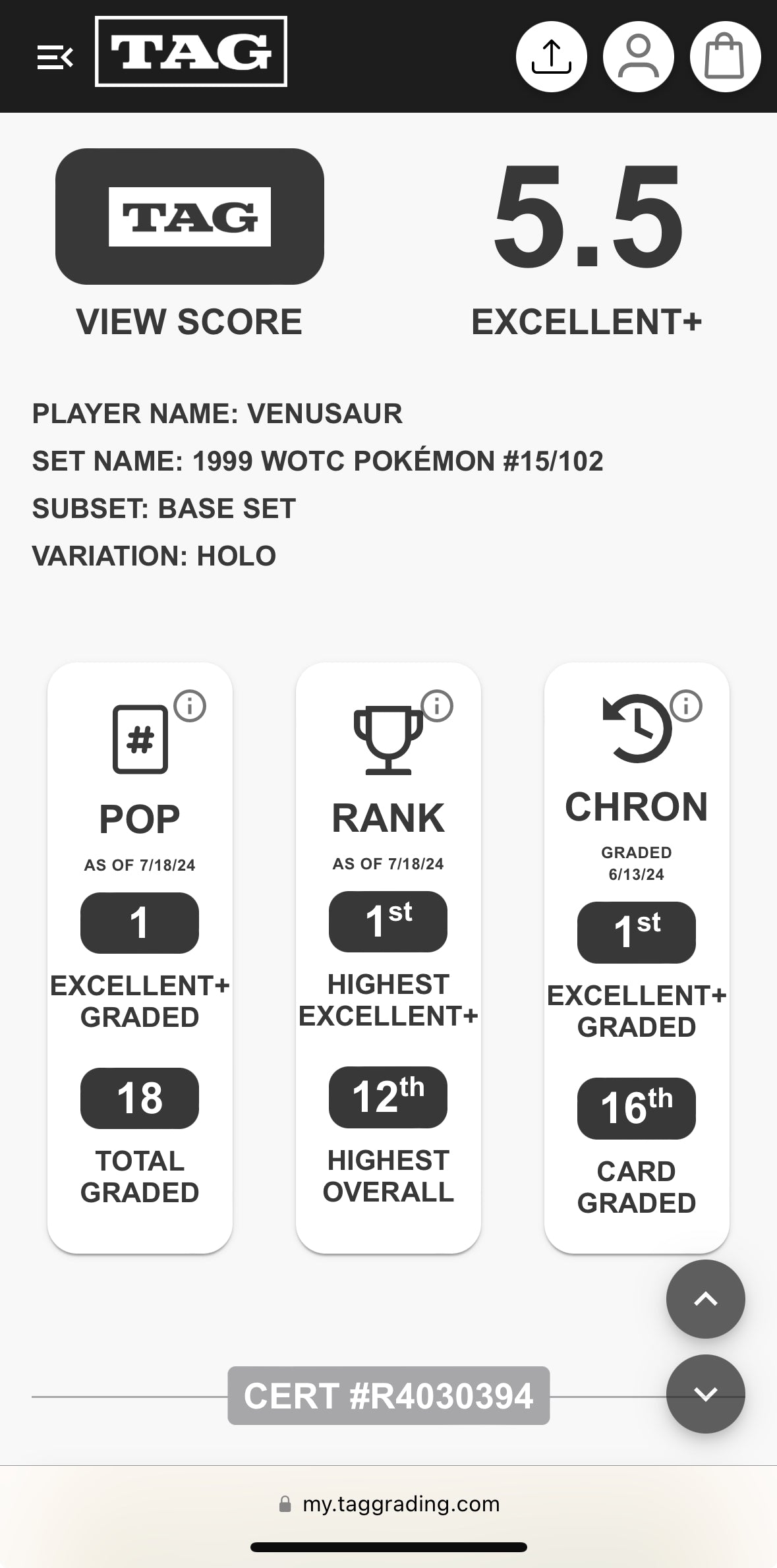 Venusaur Base set #15 TAG 5.5 or TAG 5